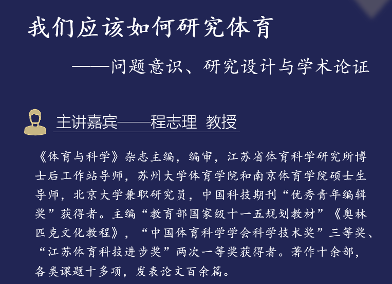 7月2日晚,3200威尼斯青年教师联谊会“青椒汇”系列活动之“主编谈”活动顺利在线举行。《体育与科学》杂志主编、编审,江苏省体育科学研究所博士后工作站导师,苏州大学体育学院和南京体育学院硕士生导师程志理教授应邀作题为“我们应该如何研究体育——问题意识、研究设计与学术论证”的主题报告。