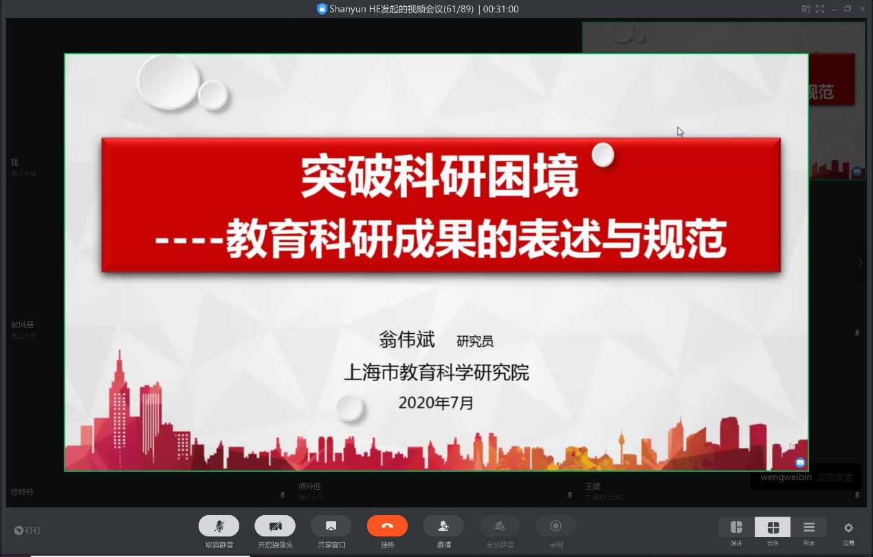 7月9日下午,学院青年教师联谊会“青椒汇·主编谈”暨研究生科研能力提升系列活动顺利举办。《教育发展研究》资深编辑、《上海职业教育》副主编、上海市教育科学研究院翁伟斌研究员应邀作“突破科研困境——教育科研成果的表述与规范”的线上主题讲座。学院副院长阚阅教授主持讲座。