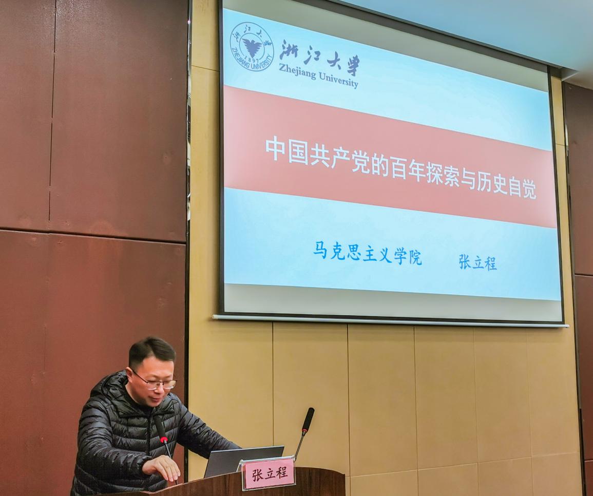 动员部署会后,组织开展“党史学习教育专题第一讲”,马克思主义学院张立程副教授应邀以《中国共产党的百年探索与历史自觉》为主题做讲座。他首先回顾“百年简史(1921-2021)”,让师生党员清晰把握党史脉络;其次重点阐释“四大探索与四大自信”,百年党史是中国共产党人不断进行道路探索、理论探索、制度探索和文化探索的奋斗史,历经百年的中国共产党人不断汲取经验智慧,牢固树立起道路自信、理论自信、制度自信和文化自信;最后,梳理总结“共产党人的历史自觉”,历史自觉是中国共产党在把握历史运行规律的基础上,不断营造社会发展前景的思维意识,更是一种主动把握历史规律、主动作为推进历史发展的行为。共产党人在每个重要的历史时期,都能依靠“历史自觉”找到正确道路。