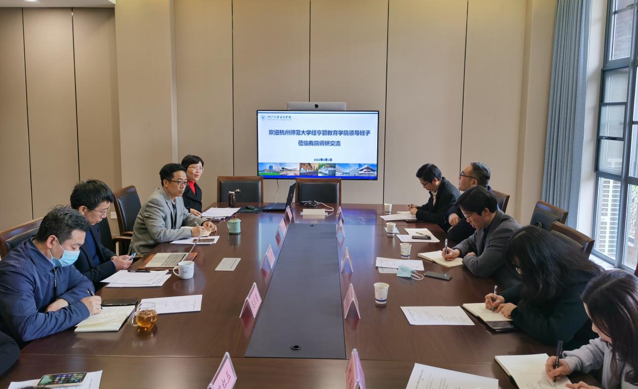 3月1日,杭州师范大学经亨颐3200威尼斯领导班子一行来院调研,双方就教育博士招生和培养、社会服务和教育合作以及党建等方面进行充分交流与探讨。会议由常务副院长阚阅主持。